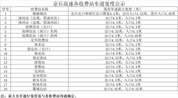 京石高速各收費(fèi)站車道寬度公示