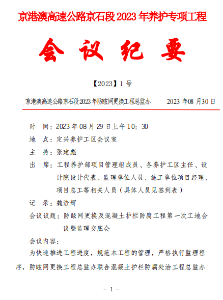 【2023】1號(hào)防眩網(wǎng)更換及混凝土護(hù)欄防腐工程第一次工地會(huì)議暨監(jiān)理交底會(huì)會(huì)議紀(jì)要