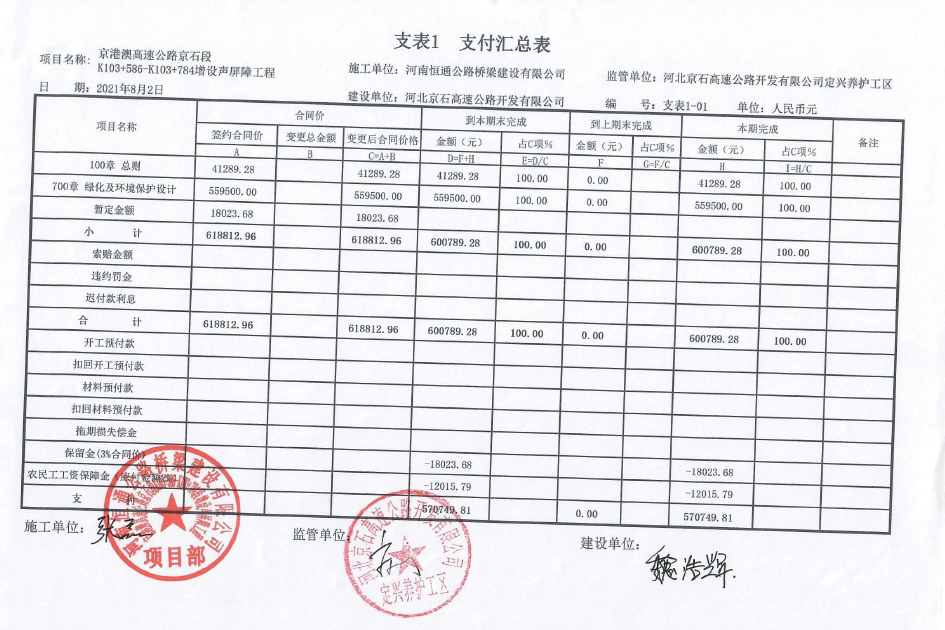 京港澳高速公路京石段K103+586-K103+784段增設(shè)聲屏障工程支付證書