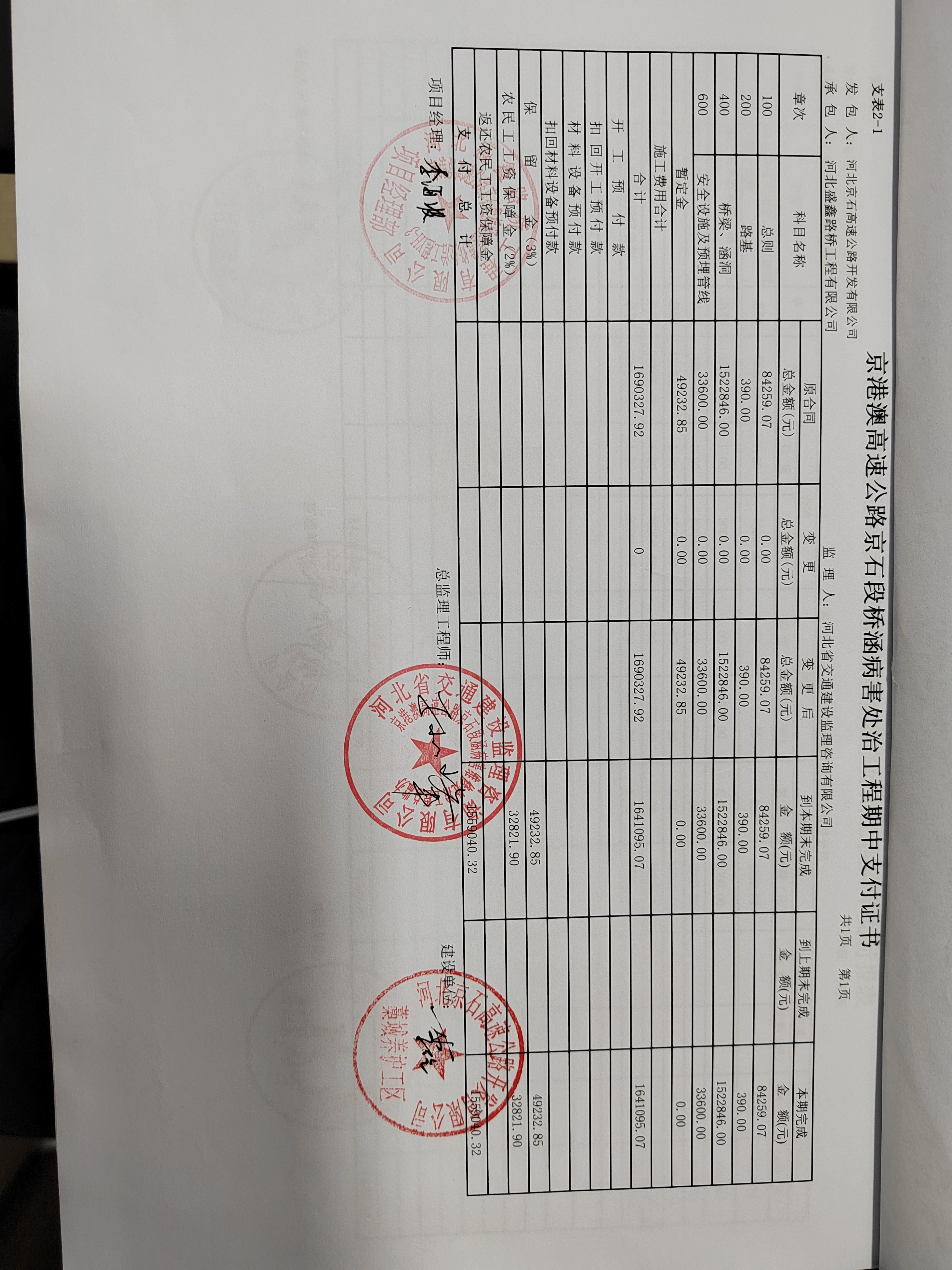 京港澳高速公路京石段橋涵病害維修處治工程YH-3標(biāo)段支付證書