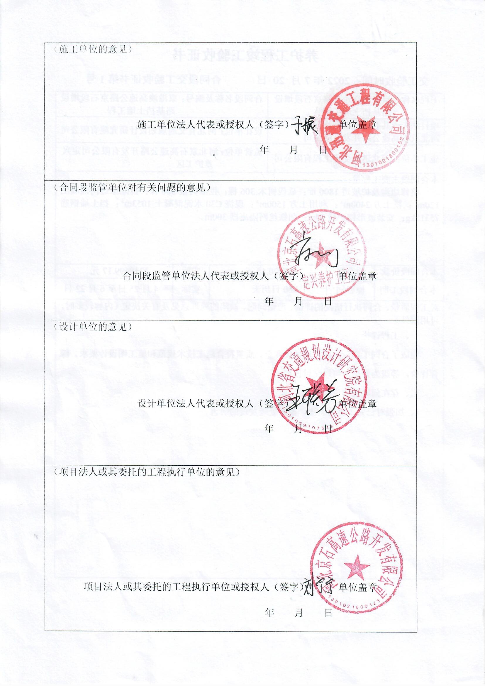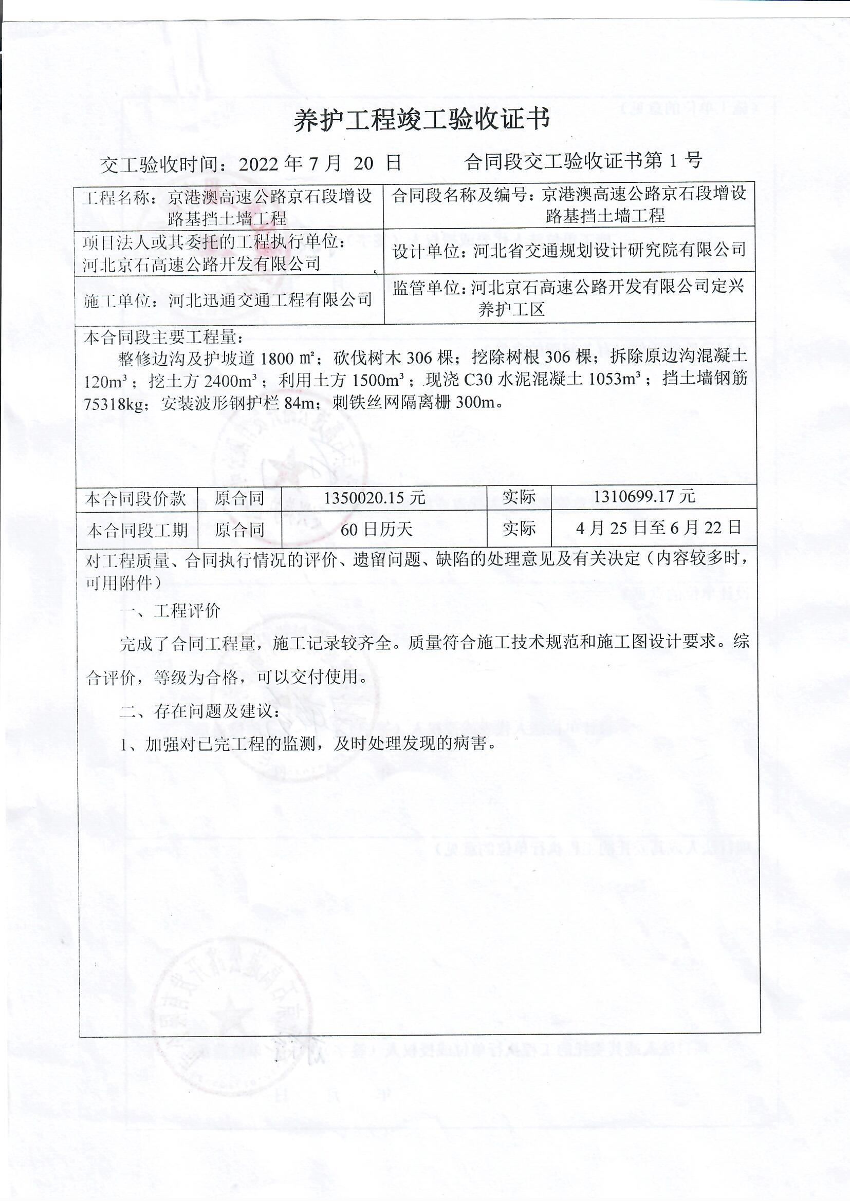 京港澳高速公路京石段增設路基擋土墻工程驗收證書