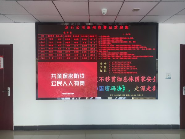二是加強(qiáng)線下宣傳展示,提升公眾直觀認(rèn)知。涿州站在辦公區(qū)、收費(fèi)站張貼2張主題海報(bào),利用電子顯示屏滾動(dòng)播放保密公益宣傳片及國(guó)家安全宣傳口號(hào),從早到晚不間斷。過往人員能直觀了解國(guó)家安全的重要性,有效擴(kuò)大了宣傳覆蓋面與影響力。