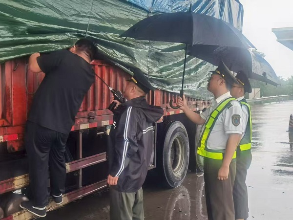 “綠通車輛車身重,雨天路滑易打滑,大家引導(dǎo)時(shí)務(wù)必站在安全區(qū)域,仔細(xì)核對(duì)證件和貨物信息!”突擊隊(duì)隊(duì)長(zhǎng)的喊話雖被雨聲切割成碎片,卻清晰地傳到每個(gè)隊(duì)員耳中。而此時(shí)正值綠通車輛通行高峰,新鮮蔬菜、水果等物資運(yùn)輸車源源不斷駛來。若因暴雨導(dǎo)致查驗(yàn)效率下降,不僅會(huì)造成車道擁堵,更可能讓鮮活物資因延誤受損。突擊隊(duì)隊(duì)長(zhǎng)一聲令下,幾名黨員迅速集結(jié),攜帶查驗(yàn)工具、防滑墊、警示錐等物資,沖向雨勢(shì)最猛的收費(fèi)廣場(chǎng)。