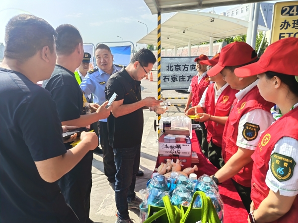 座談會(huì)后,雙方黨支部的黨員志愿者共同前往徐水收費(fèi)站外廣場(chǎng),設(shè)立“雙節(jié)便民服務(wù)站”,以志愿服務(wù)踐行初心使命。黨員們佩戴黨徽、亮明身份,分工協(xié)作開展服務(wù):