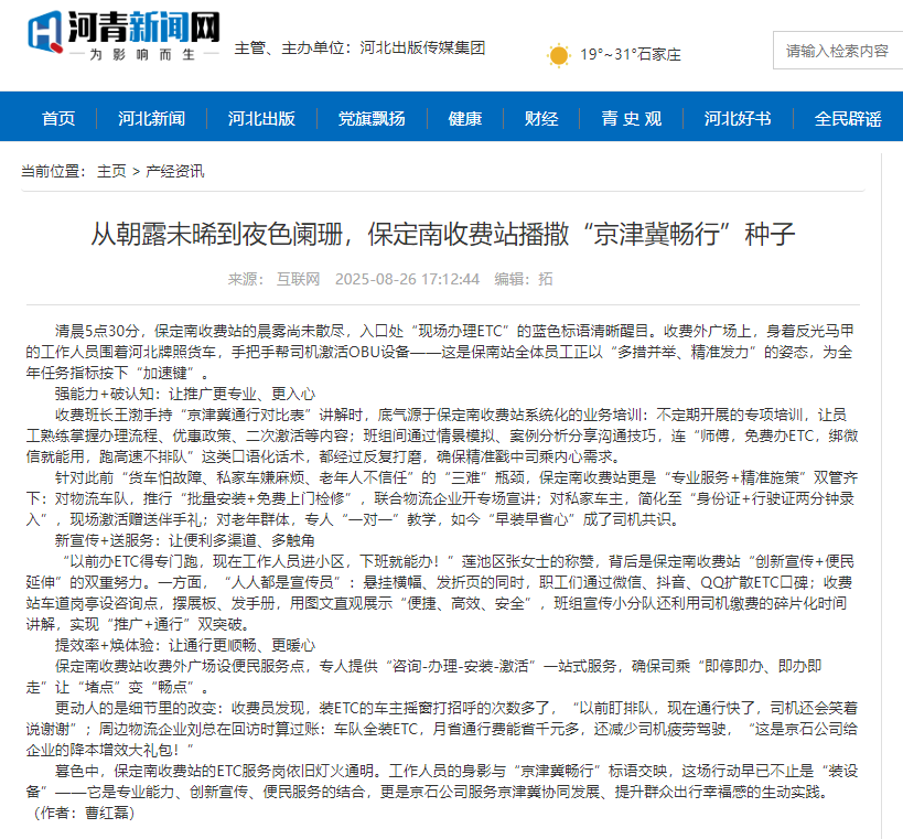 【河青新聞網(wǎng)】從朝露未晞到夜色闌珊,保定南收費(fèi)站播撒“京津冀暢行”種子
