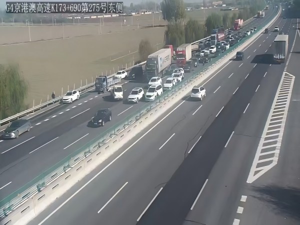 11月15日11時25分,智慧調(diào)度中心監(jiān)控人員通過視頻巡檢發(fā)現(xiàn),京石高速南行K173處發(fā)生兩輛貨車追尾事故,占據(jù)兩條車道,導(dǎo)致后方車流積壓,現(xiàn)場通行緩慢且風(fēng)險加劇。