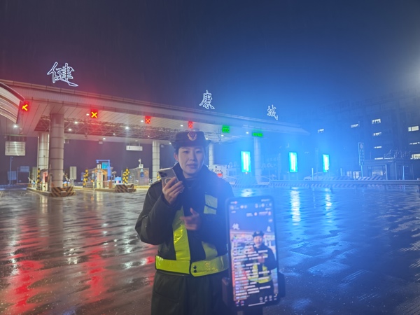 “大家好,我現(xiàn)在就在健康城站站口?!笔召M(fèi)員閆孟茜面向鏡頭,正通過直播向司乘人員介紹雪天路況與安全提示。雪花不時(shí)掠過鏡頭,她的聲音熱情、有力,實(shí)時(shí)播報(bào)著收費(fèi)站區(qū)及主線省界的通行情況,為屏幕前的司乘人員提供了第一手、最直接的路況信息。