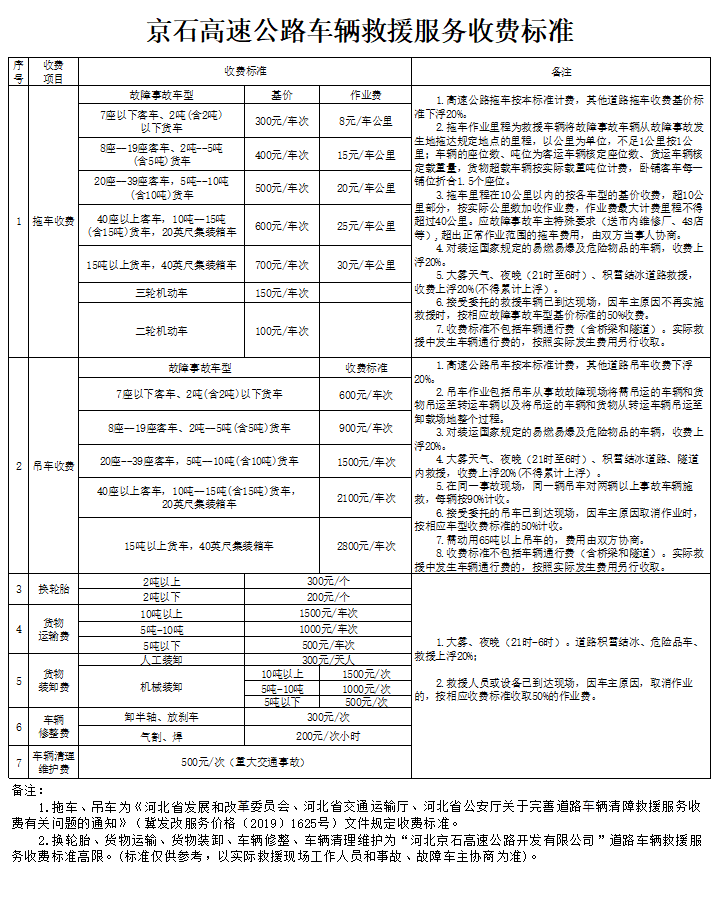 河北京石高速公路開發(fā)有限公司車輛救援服務(wù)信息公示表