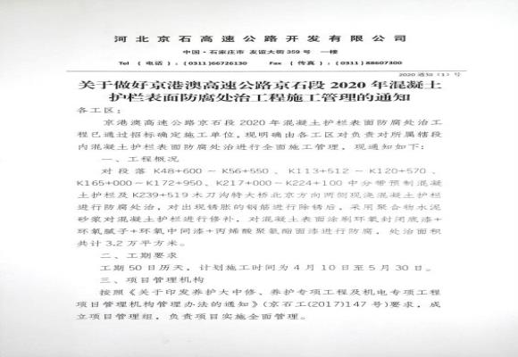 京港澳高速公路京石段沙2020年混凝土護(hù)欄表面防腐處治工程施工管理的通知