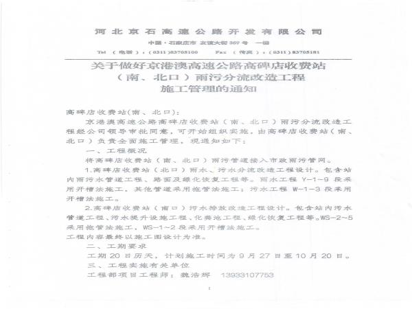 關(guān)于做好京港澳高速公路高碑店收費(fèi)站(南、北口)雨污分流改造工程施工管理的通知