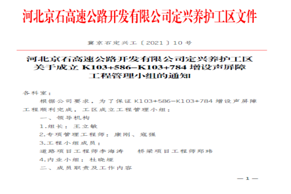 河北京石高速公路開發(fā)有限公司定興養(yǎng)護(hù)工區(qū)關(guān)于成立K103 586_K103 784增設(shè)聲屏障工程管理小組的通知
