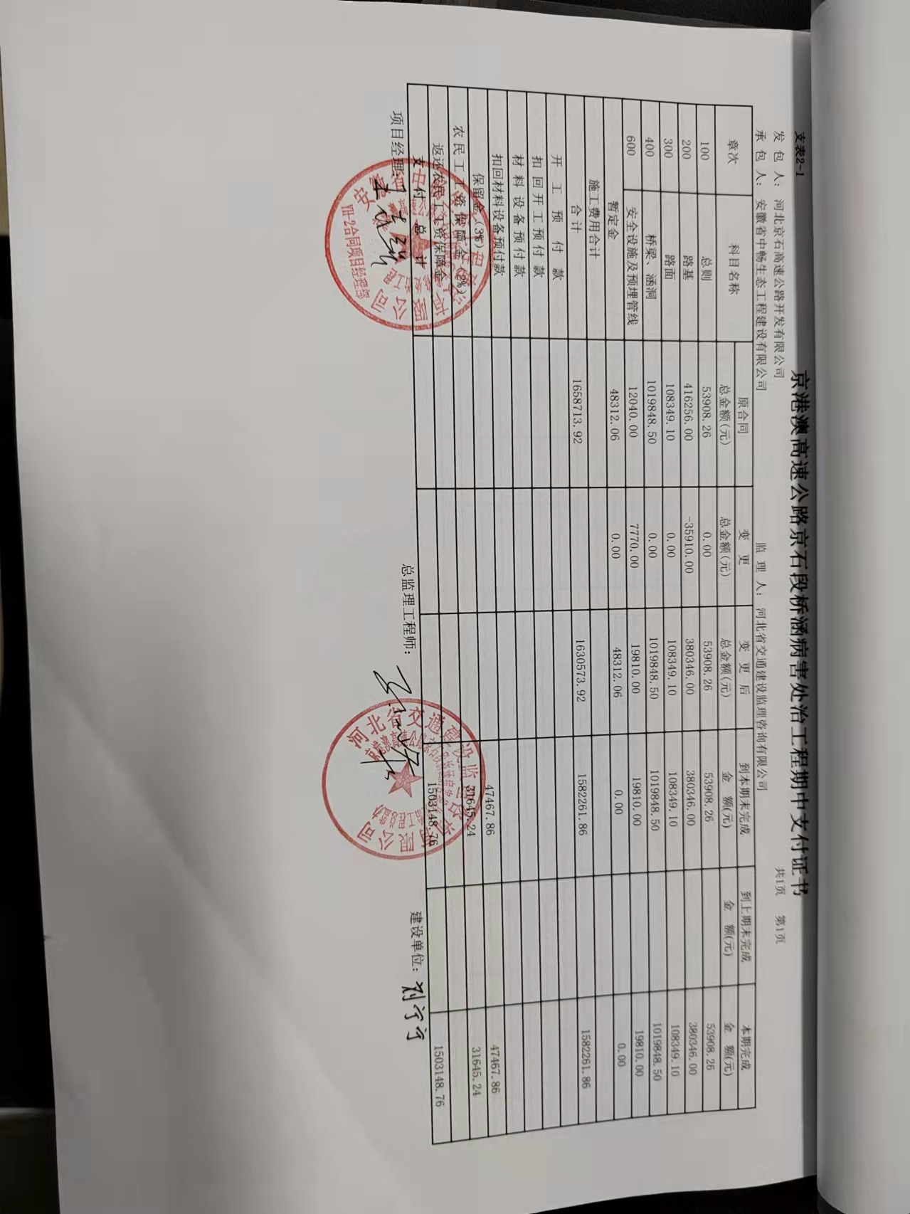 京港澳高速公路京石段橋涵病害維修處治工程YH-2標(biāo)段支付證書