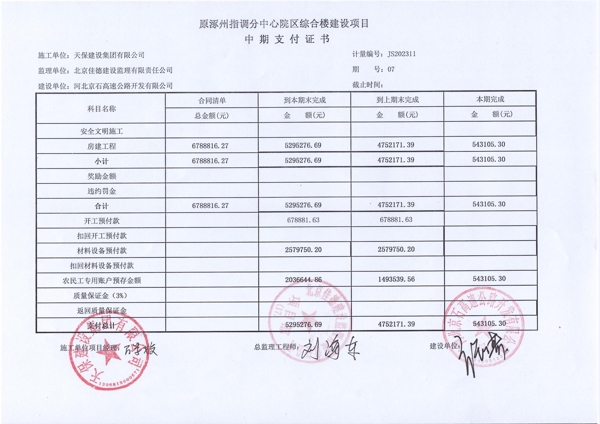原涿州指調(diào)分中心院區(qū)綜合樓建設(shè)項目第七期中期支付證書