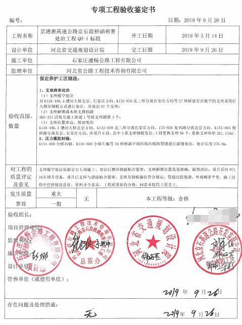 京港澳高速公路京石段橋涵病害處治工程QH-1標段工程專項鑒定書