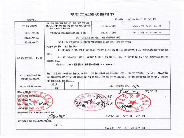 京港澳高速公路京石段2020年橋涵病害處治工程QH-2標(biāo)段驗(yàn)收證書(shū)