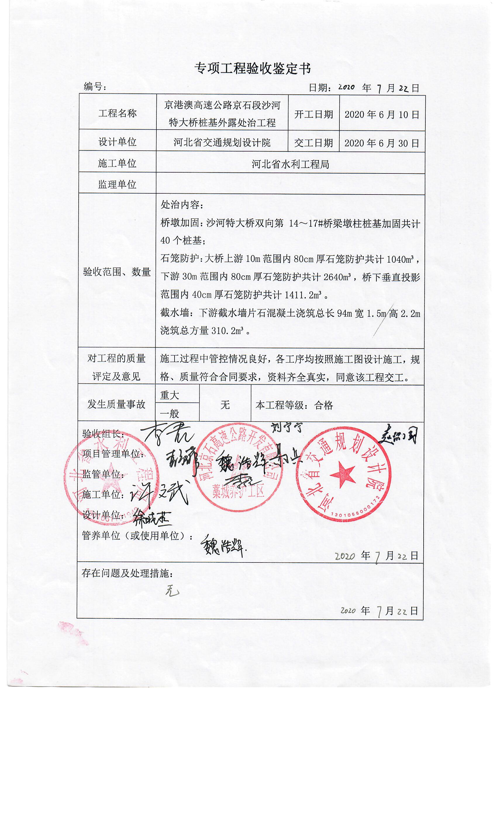 京港澳高速公路京石段沙河特大橋樁基外露處治工程驗收證書