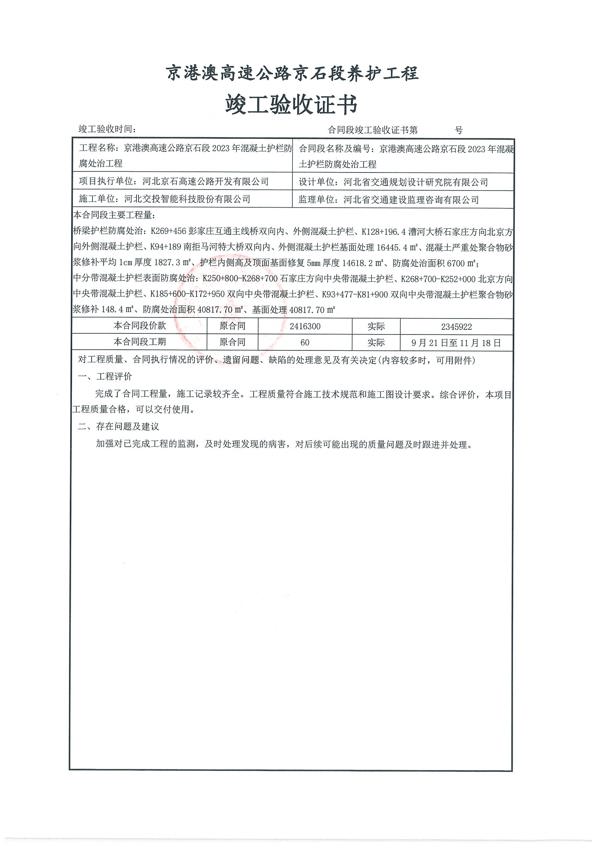 京港澳高速公路京石段2023年混凝土護(hù)欄防腐處治工程驗(yàn)收證書(shū)