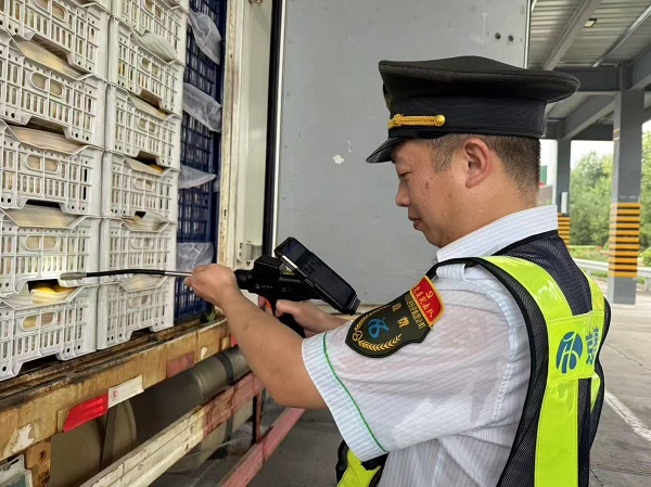 正午時分,收費站廣場地表溫度直逼60℃,瀝青路面泛起微光。黨員們身著反光背心,手持查驗終端,穿梭于一輛輛綠通貨車之間。掀開篷布時,撲面而來的熱浪裹挾著果蔬氣息,他們卻無暇擦拭額頭豆大的汗珠,仔細核對貨物品類、查驗裝載空間、拍攝留存影像。“夏季瓜果易腐壞,查驗速度就是效率,更是民生溫度?!?/p>
