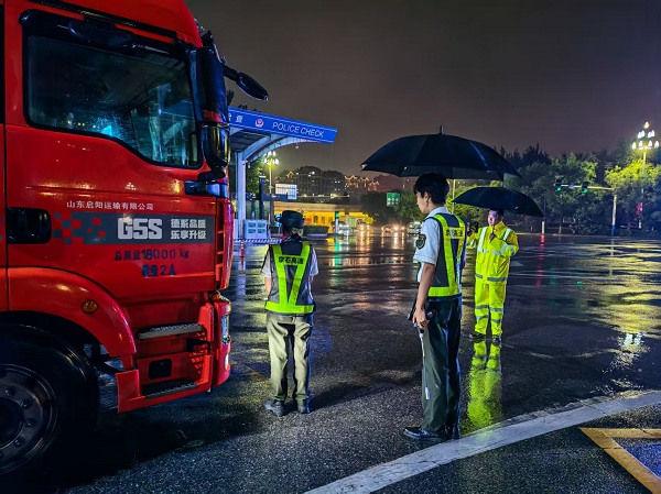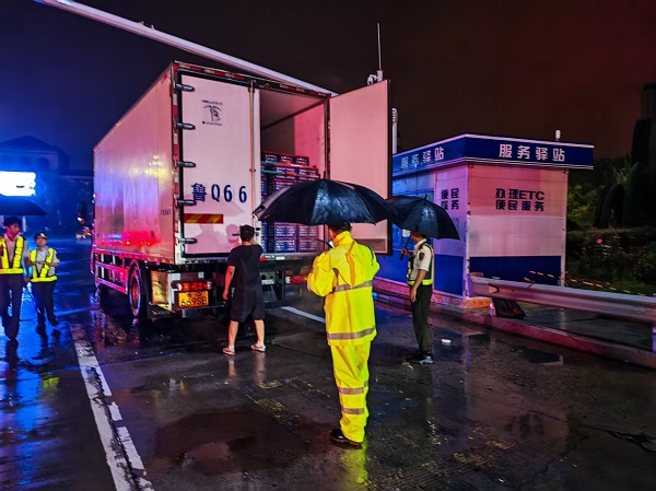 “綠通車輛車身重,雨天路滑易打滑,大家引導(dǎo)時(shí)務(wù)必站在安全區(qū)域,仔細(xì)核對(duì)證件和貨物信息!”突擊隊(duì)隊(duì)長(zhǎng)的喊話雖被雨聲切割成碎片,卻清晰地傳到每個(gè)隊(duì)員耳中。而此時(shí)正值綠通車輛通行高峰,新鮮蔬菜、水果等物資運(yùn)輸車源源不斷駛來。若因暴雨導(dǎo)致查驗(yàn)效率下降,不僅會(huì)造成車道擁堵,更可能讓鮮活物資因延誤受損。突擊隊(duì)隊(duì)長(zhǎng)一聲令下,幾名黨員迅速集結(jié),攜帶查驗(yàn)工具、防滑墊、警示錐等物資,沖向雨勢(shì)最猛的收費(fèi)廣場(chǎng)。