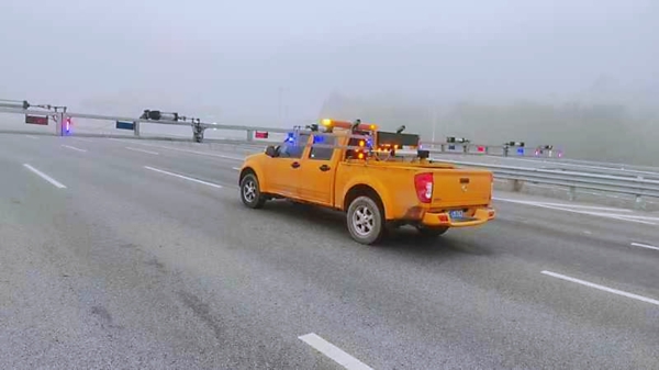 京石高速智調(diào)中心發(fā)布了大霧黃色風(fēng)險(xiǎn)預(yù)警,并下達(dá)了壓車帶道的準(zhǔn)備工作指令。定興養(yǎng)護(hù)工區(qū)接到指令后,立即在工作微信群中發(fā)布了預(yù)警信息,并做好了人員、車輛、設(shè)施設(shè)備的準(zhǔn)備工作。經(jīng)過路警會(huì)商,從健康城開始執(zhí)行壓車帶道任務(wù)。定興工區(qū)的帶道車展開“雙翼”居中,與路警車輛組成壓車隊(duì),“一”字形橫向排布在各條車道上,以40公里/時(shí)的速度帶領(lǐng)車隊(duì)安全通過霧區(qū),直至清苑收費(fèi)站,行駛里程近110公里,壓車帶道任務(wù)順利完成。全程通過車載揚(yáng)聲器進(jìn)行安全警示,提醒社會(huì)車輛注意行車安全。壓車帶道舉措顯著提升了司乘人員的通行體驗(yàn),有效減輕了道路安全壓力,為公眾出行創(chuàng)造了更加順暢、安全的交通環(huán)境。