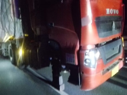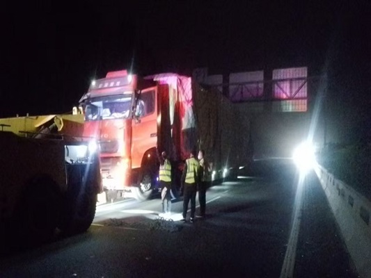 經(jīng)詢問司機(jī)得知,貨車右前輪突然掉落,導(dǎo)致車輛無法移動。事發(fā)突然,且處于夜間,大風(fēng)呼嘯,情況十分危險(xiǎn)。定州工區(qū)工作人員立即反應(yīng),第一時(shí)間在貨車后方規(guī)范設(shè)置交通警示標(biāo)志,巡查車開啟導(dǎo)向標(biāo)、高音警報(bào)器,避免過往車輛發(fā)生碰撞事故,引導(dǎo)車上人員轉(zhuǎn)移至護(hù)欄外安全地帶。同時(shí),迅速撥打高速交警與救援電話,通報(bào)現(xiàn)場情況。智調(diào)中心及時(shí)利用可變情報(bào)板對后方來車予以提醒,避免造成事故。