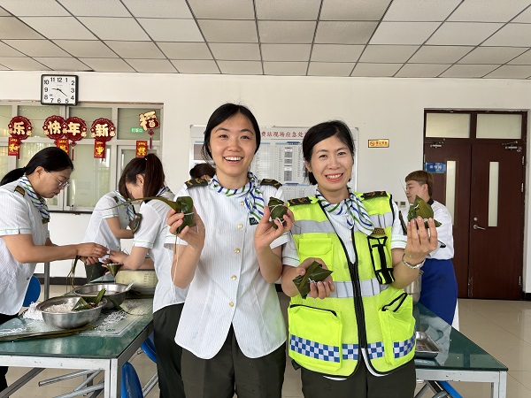 大鍋被這千姿百態(tài)的粽子堆滿了,這份沉甸甸的“滿”,像極了大家心中膨脹的情感,這層層疊疊的粽葉包裹著的是我們對工作順遂的期冀,對司乘平安的祝福、對佳節(jié)圓滿的愿望,就讓這粽葉飄香,越過崗亭,守護每一位司乘,為其保駕護航。