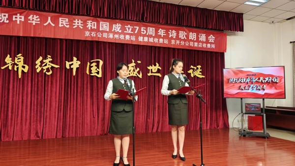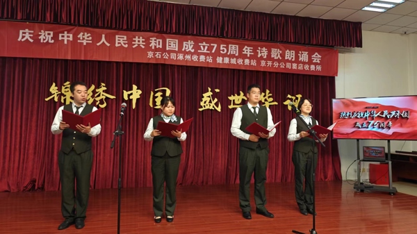 錦繡中國(guó),盛世華誕,七十五載,征程如虹。為隆重慶祝中華人民共和國(guó)成立七十五周年,延續(xù)京冀兩地高速收費(fèi)站共建深情,共同抒發(fā)熱烈的愛(ài)國(guó)情懷,9月30日上午,健康城收費(fèi)站、涿州收費(fèi)站黨支部聯(lián)合兩站分會(huì)與京開(kāi)分公司竇店收費(fèi)所,在健康城站共同開(kāi)展了慶祝中華人民共和國(guó)成立75周年詩(shī)歌朗誦會(huì)活動(dòng)。奮斗在祖國(guó)交通事業(yè)一線的工作者們,滿懷豪情,把對(duì)祖國(guó)的無(wú)盡熱愛(ài)熔鑄于一首首激情澎湃的詩(shī)篇之中,以詩(shī)的激昂韻律,歌頌祖國(guó)的壯麗騰飛。