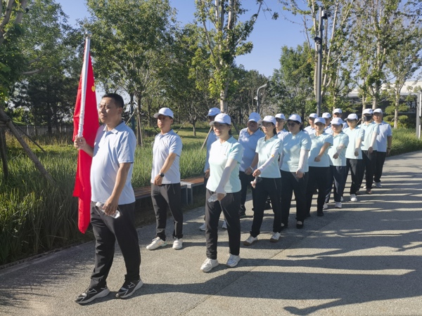 夏日的絲路友誼園綠意盎然,蜿蜒步道如一條銀色紐帶。員工們精神飽滿,步伐矯健,在黨旗的引領下闊步前行。一枚枚胸前閃耀的黨徽,在綠樹碧草的映襯下格外醒目,無聲訴說著對黨的忠誠信仰。